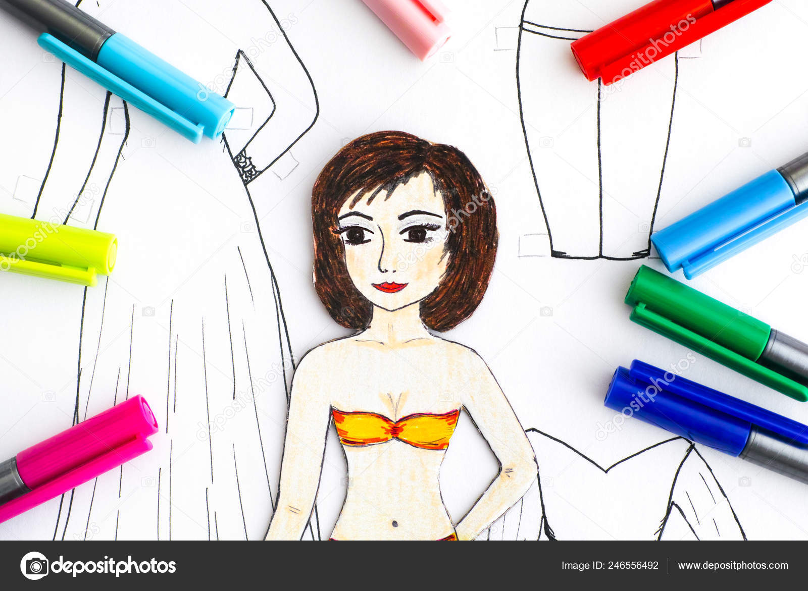 Paper Doll Paper Drawing Clothes Colored Pens Close Stock Photo